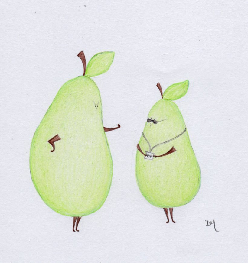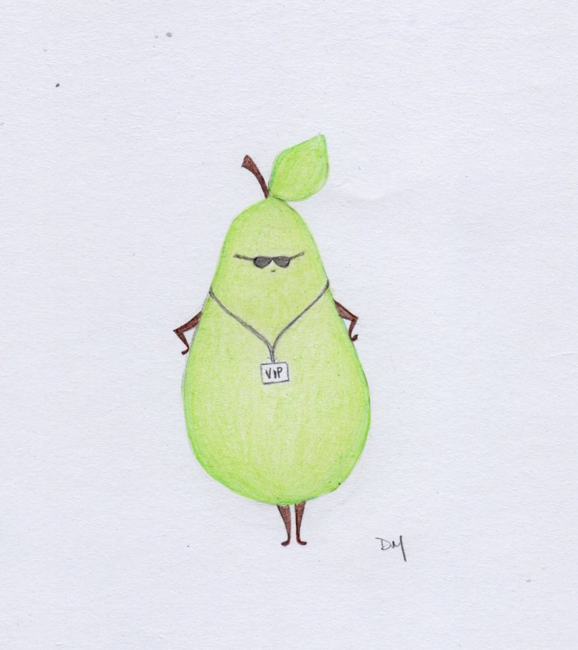 V.I.P. November 26, 2010 by angriestpear 1 Comment Very Important Pear “What do you mean I can’t come in? I’m a Very Important Pear!” Share this: Click to share on Facebook (Opens in new window) Facebook Click to share on X (Opens in new window) X Click to email a link to a friend (Opens in new window) Email Click to share on Pinterest (Opens in new window) Pinterest Click to share on Reddit (Opens in new window) Reddit Click to share on Tumblr (Opens in new window) Tumblr Click to share on LinkedIn (Opens in new window) LinkedIn Like Loading... Related Author: angriestpear Poet, Knitter, Illustrator of Pears