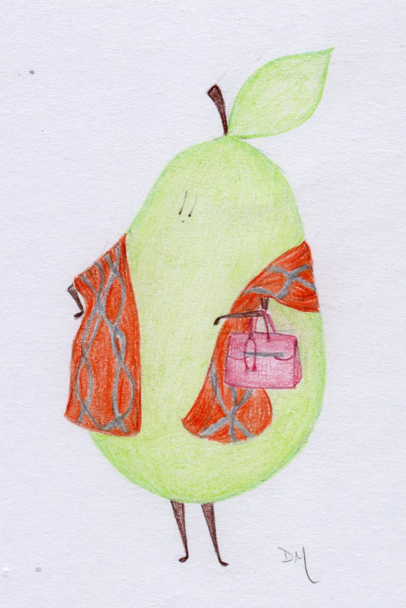 Pearmès January 28, 2011 by angriestpear 5 Comments The real Paris fashion week may be over, but I could not resist posting this luxurious pear. Share this: Click to share on Facebook (Opens in new window) Facebook Click to share on X (Opens in new window) X Click to email a link to a friend (Opens in new window) Email Click to share on Pinterest (Opens in new window) Pinterest Click to share on Reddit (Opens in new window) Reddit Click to share on Tumblr (Opens in new window) Tumblr Click to share on LinkedIn (Opens in new window) LinkedIn Like Loading... Related Author: angriestpear Poet, Knitter, Illustrator of Pears