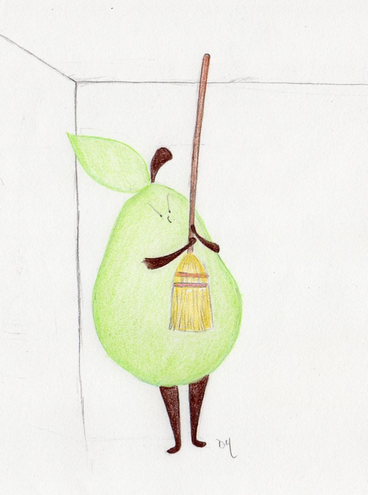 I can take this many ways, but the first that comes to mind is the pear wanting to wack someone with the broom. It’s quite adorable.