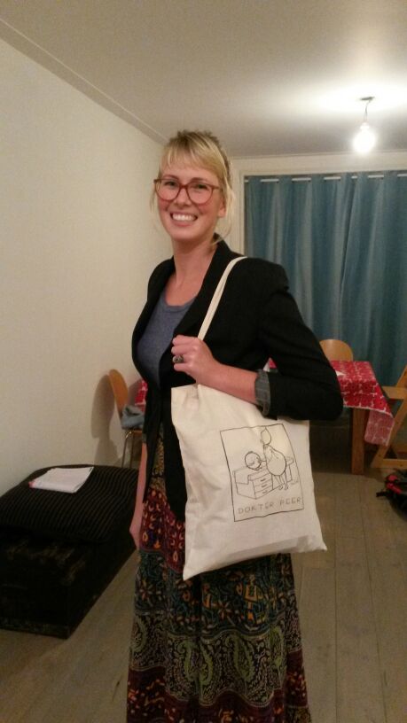 A few months ago, Esther, a very nice woman in Europe (probably the Netherlands given the Dutch description), contacted me about doing this custom drawing (a doctor pear tending to a sick blueberry). She wanted to give the picture to her friend as a gift for finishing medical school. I LOVED the project because their nicknames for each other are pear and blueberry– very cute! Esther ended up putting the image on a bag for her friend, and I think it looks amazing!