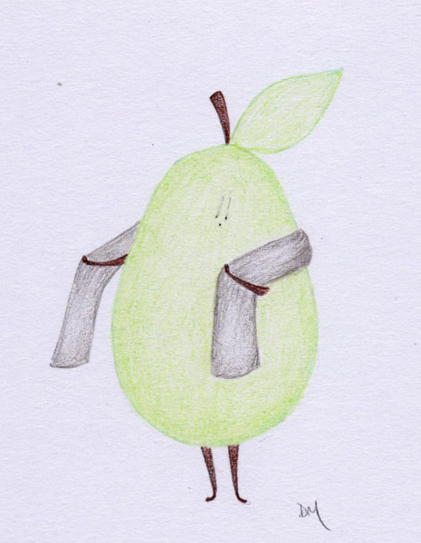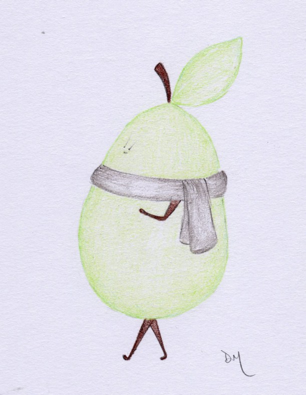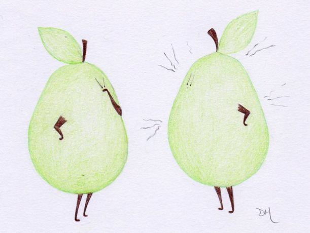 A few weeks ago, two pears found themselves fighting over the same scarf. The quarrel grew heated and the scarf was torn in two. (Read the full post here.)